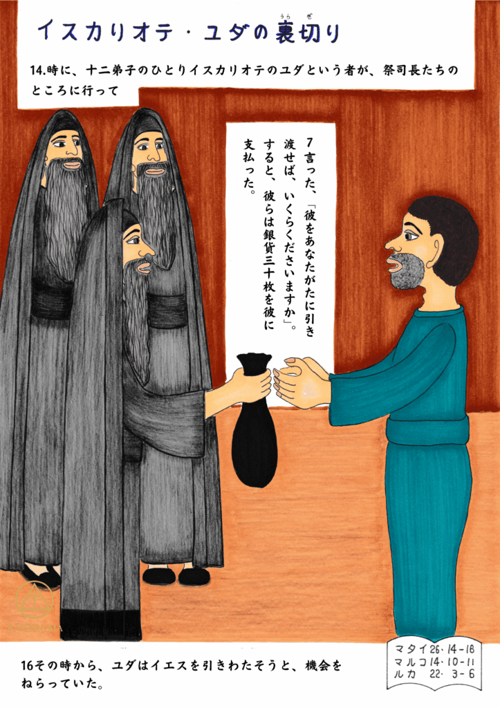 前回、ベタニヤでマリヤがイエス様に埋葬の準備のための高価な香油を注がれました。その時ユダがイエス様から叱責されたことに腹を立て、祭司長のもとに行って、イエスを売り渡しその報酬として30枚の銀貨を受け取ります。