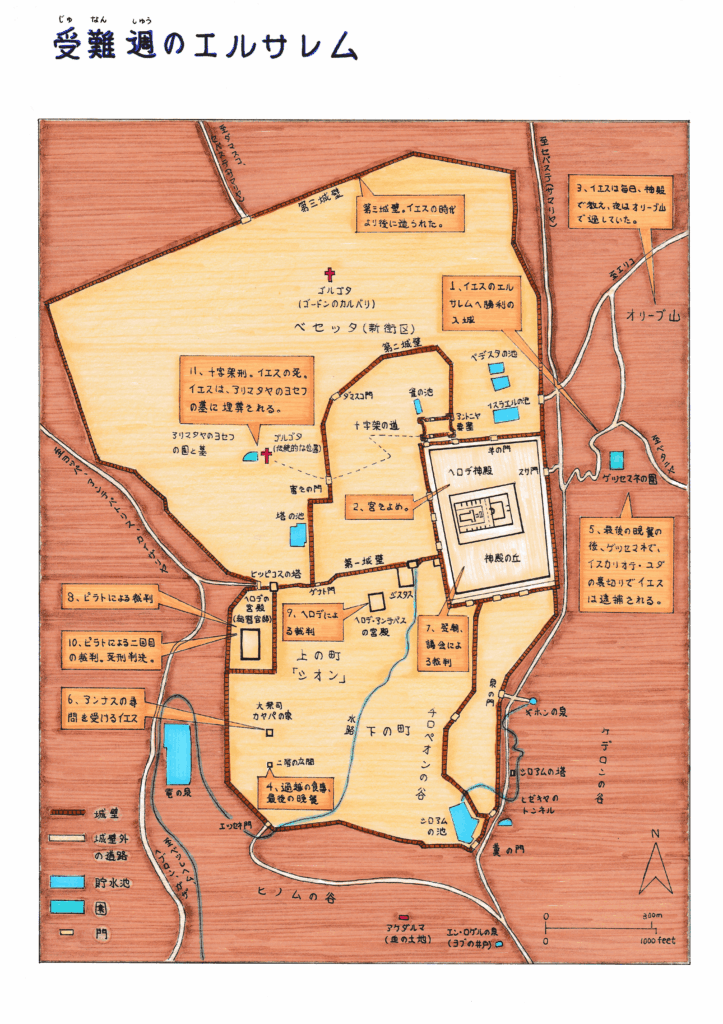 【代替テキスト】 受難週におけるイエス・キリストの足跡を描いたエルサレムの手描き地図。オリーブ山からゲッセマネ、ピラトの官邸、ゴルゴダに至るまでの経路が日本語で記されている。